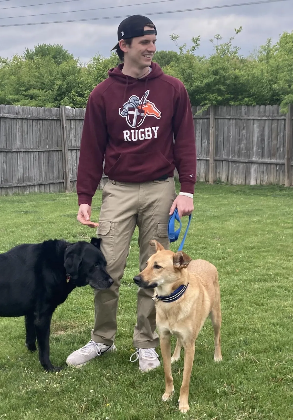 Me in 2021 after starting T&B; with my dogs at the time: Sam (black, left) and Gibson (tan, right)