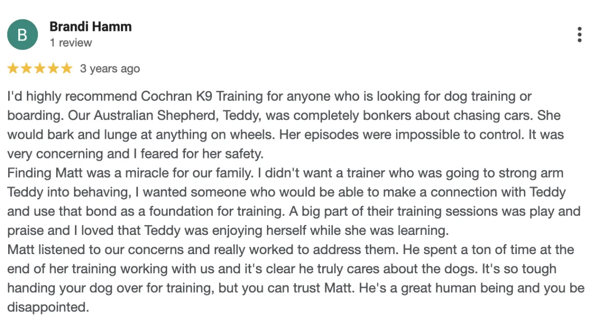 Matt is a TWC-certified professional dog trainer who owns Cochran K9 Training, located outside of Pittsburgh, PA. He's been training dogs for 7 years, and about 3 years ago, went all-in on specializing in reactivity and aggression rehabilitation.