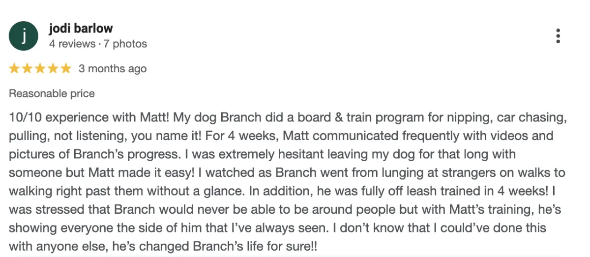 His behavior modification Board & Train program is 6 weeks, costs $5,000, and regularly has a waitlist. And the reason he’s so in-demand is because he openly documents and shares the before, during, and after for all of his cases.